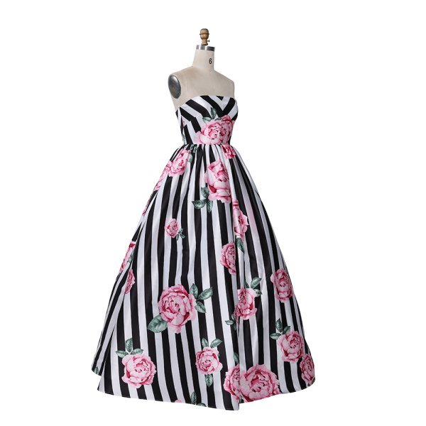 New Design Black Striped and Printed Satin Fabric Strapless Gown Prom Dress