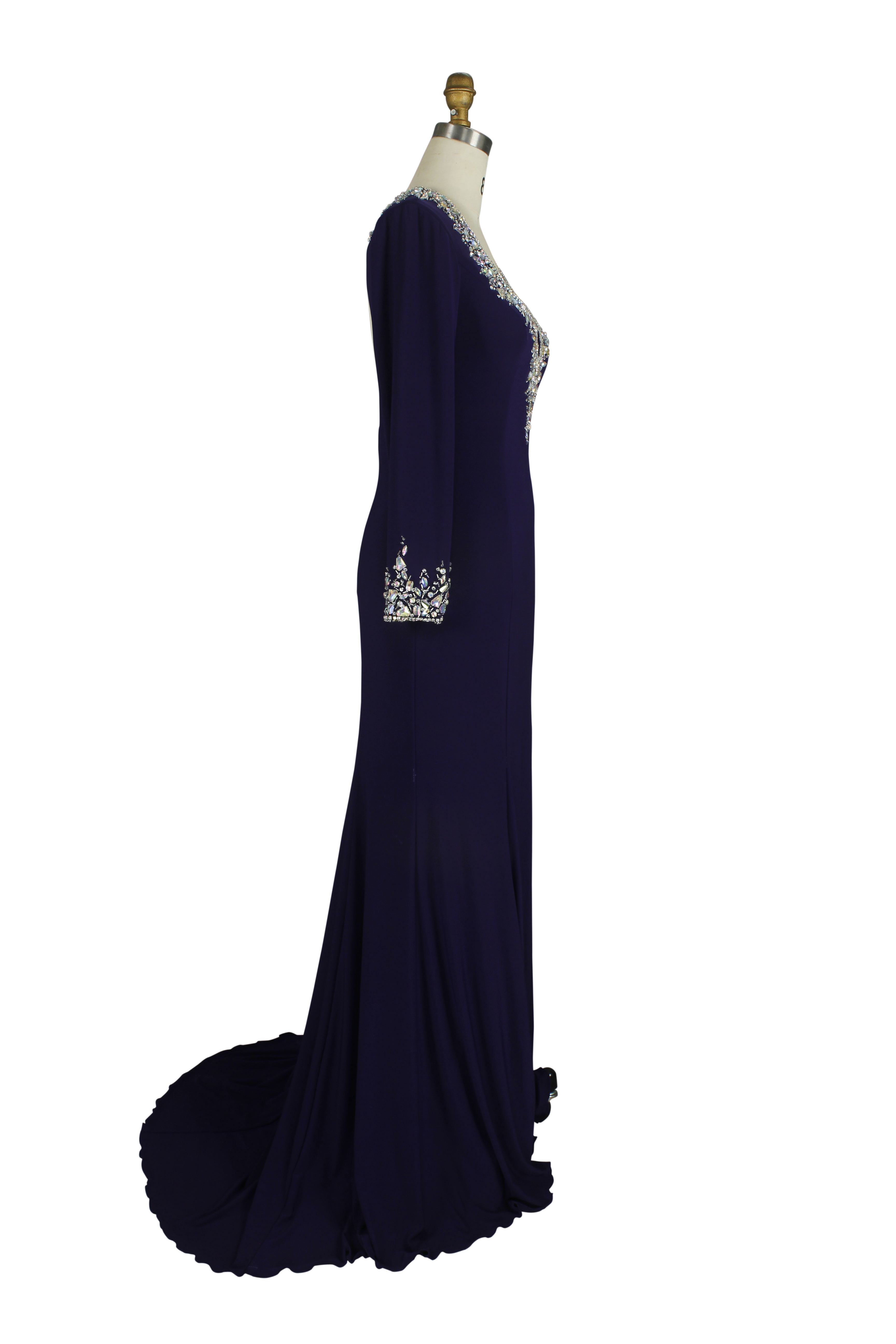 Fashion Crystal Beads Design with V-neckline and Cuff, Jersey Long Sleeves Evening Dress with High Split and Open Back.