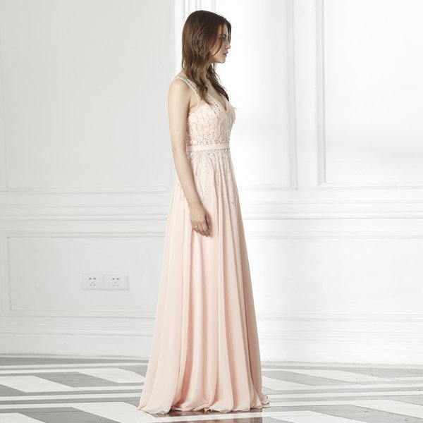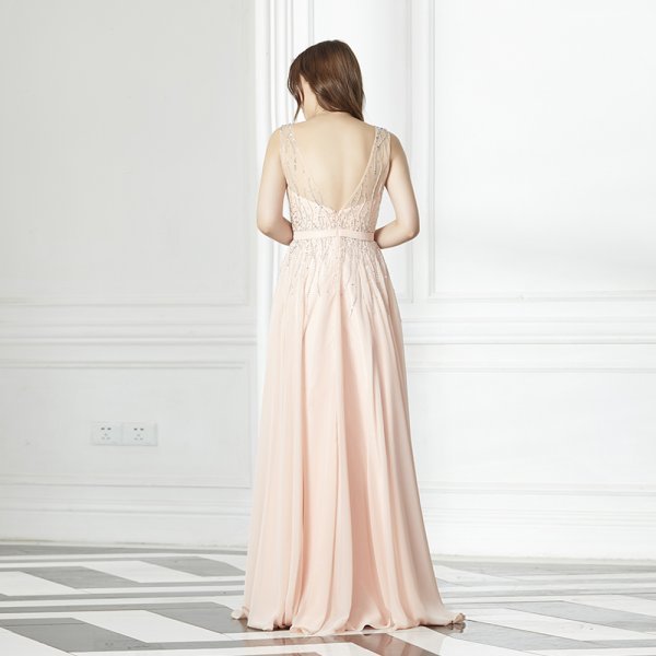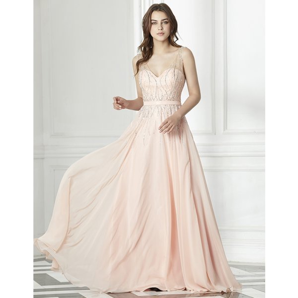 Chiffon A-Line Long Evening Prom Dress with illusion V neckline and back, exquisite handmade beaded pattern design worth girls’ attention.