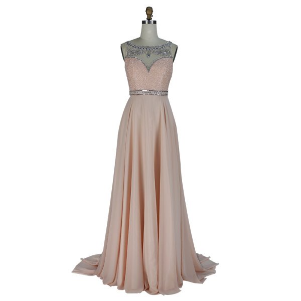 Illusion crystal beaded pattern top and back, beading waistband and exquisite round neckline connect with sweetheart, this A-line chiffon sleeveless prom dress worth ladies’s attention.